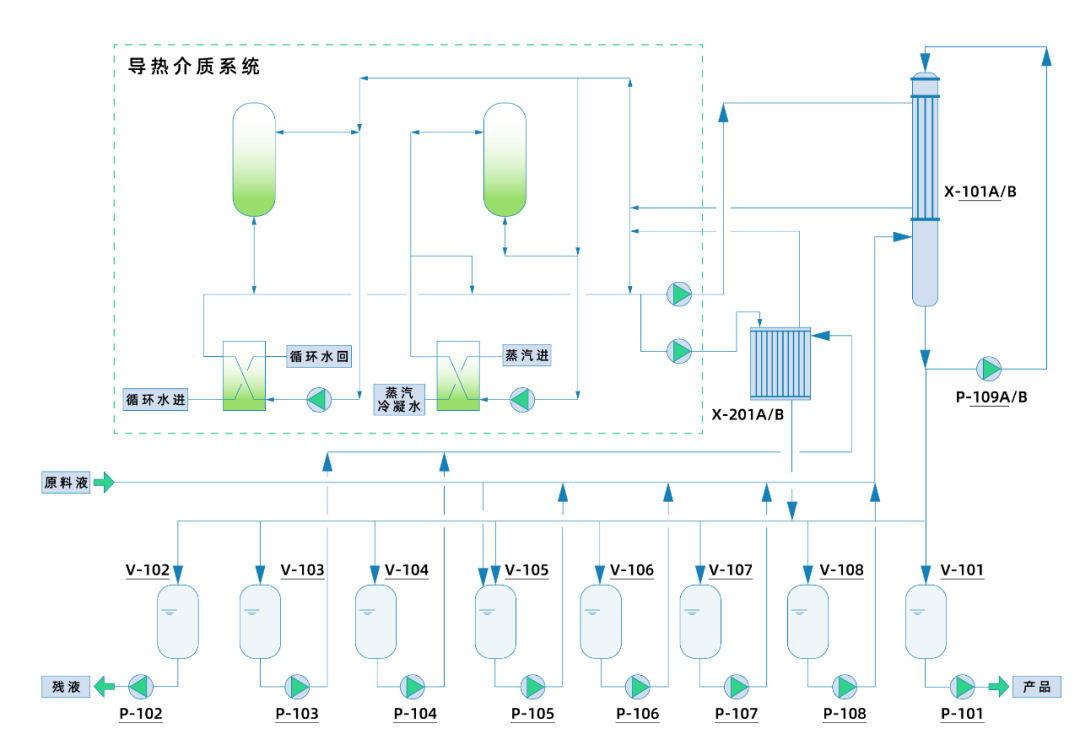 降膜结晶器采用壳程降膜式冷热媒循环,持液量小、传热效率高,单批次周期仅需2-3小时;能耗较传统工艺降低30%,蒸汽消耗低,循环水用量低。